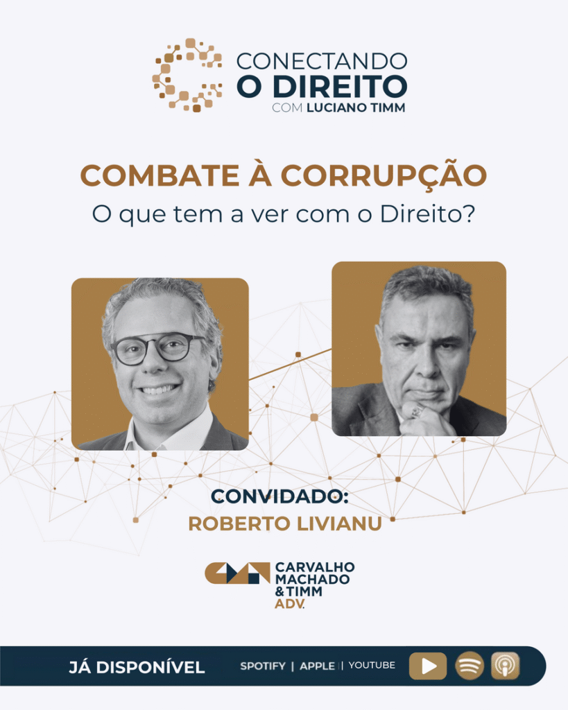 No episódio #37 do Conectando o Direito, o sócio-fundador Luciano Benetti Timm recebe Roberto Livianu, Procurador de Justiça do Ministério Público de São Paulo, doutor em Direito pela USP e presidente do Instituto Não Aceito Corrupção.